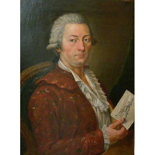 Porträtt av Scheele iklädd en röd banyan, hållandes ett papper i handen med en teknisk apparatur. Porträtt av okänd.